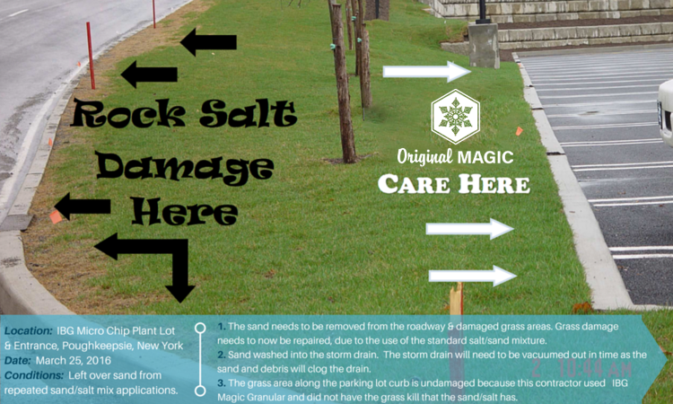 - The grass area along the parking lot curb is undamaged because this contractor used OG treated salt and did not have the grass kill that the salt/sand caused.